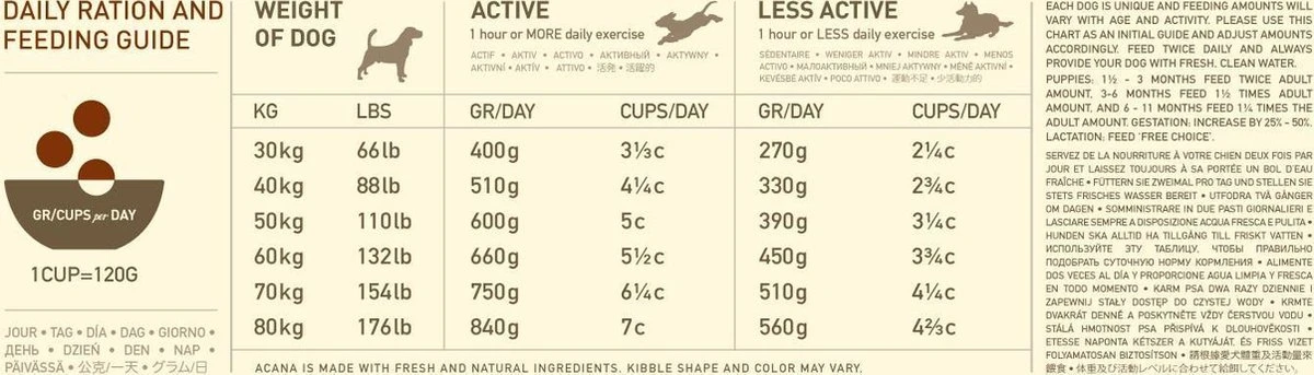 | Voedingsadvies | Voedingsdavies Acana Heritage Large Adult hondenvoer<br /><br />Lichaamsgewicht van de hond(in kilogram) Hoeveelheid droogvoer bij een actieve levensstijl (in gram) Hoeveelheid droogvoer bij een minder actieve levensstijl (in gram) <br />30 400 270 <br />40 510 330 <br />50 600 390 <br />60 660 450 <br />70 750 510 <br />80 840 560 |