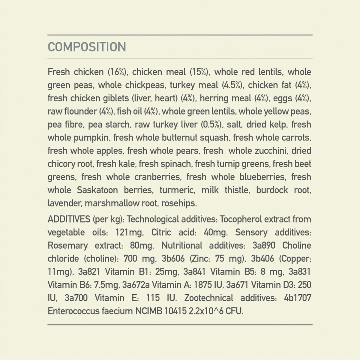 SamenstellingVerse gefileerde kip (12%)*, Gedroogd kippenvlees (12%), Gedroogd kalkoenvlees (12%), Rode linzen, Hele groene erwten, Veldbonen, Kippenvet (5%), Vers kippen orgaanvlees (lever, hart en nier)(4%)*, Gedroogde haring (4%), Verse hele eieren (4%)*, Verse gefileerde platvis (4%)*, Haring olie (2%), Zongedroogde alfalfa, Groene linzen, Hele gele erwten, Erwtenvezels, Vers kippenkraakbeen (1%)*, Gedroogd bruin zeewier, Verse hele pompoen*, Verse hele muskaat pompoen*, Verse hele pastinaak*, Verse boerenkool*, Verse spinazie*, Verse mosterdplant blad*, Verse raapstelen*, Verse hele wortelen*, Verse Red Delicious appels*, Verse Barlett peren*, Gevriesdroogde kippenlever, Gevriesdroogde kalkoenlever, Verse hele veenbessen*, Verse hele blauwe bessen*, Cichoreiwortel, Kurkuma, Mariadistel, Kliswortel, Lavendel, Heemstwortel, Rozenbottels.