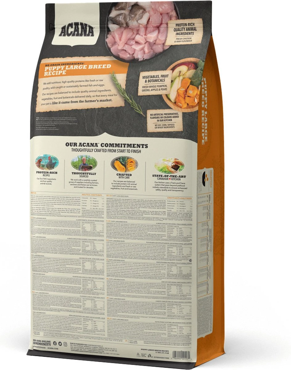 Acana Heritage Puppy Large Breed Bereid in onze gecertificeerde keukens in Canada is Acana Puppy Large Breed rijk aan lokaal gefokte scharrel kip, scharrel eieren, in het wild gevangen platvis, zongerijpt fruit en groenten – geleverd rijk aan voedingssto en door boeren en telers uit onze regio zodat uw puppy gezond sterk en gelukkig kan zijn. Acana Heritage wordt bereid volgens de whole prey gedachte: door het gebruik van spiervlees, orgaanvlees en eetbaar bot kunnen de synthetische toevoegingsmiddelen worden beperkt tot uitsluitend zink. Alle voedingstoffen in Acana Heritage zijn afkomstig van natuurlijke oorsprong (behalve zink) wat er voor zorgt dat de aanwezige voedingstoffen eenvoudig zijn te ge- en verbruiken. Samenstelling Verse gefileerde kip (16%)*, Gedroogd kippenvlees (15%), Gedroogd kalkoenvlees (14%), Rode linzen, Hele groene erwten, Vers kippen orgaanvlees (lever, hart en nier)(6%)*, Gedroogde haring (4%), Verse hele eieren (4%)*, Verse gefileerde platvis (4%)*, Haring olie (3%), Zongedroogde alfalfa, Veldbonen, Groene linzen, Hele gele erwten, Erwtenvezels, Kippenvet (2%), Vers kippenkraakbeen (2%)*, Gedroogd bruin zeewier, Verse hele pompoen*, Verse hele muskaat pompoen*, Verse hele pastinaak*, Verse boerenkool*, Verse spinazie*, Verse mosterdplant blad*, Verse raapstelen*, Verse hele wortelen*, Verse Red Delicious appels*, Verse Barlett peren*, Gevriesdroogde kippenlever, Gevriesdroogde kalkoenlever, Verse hele veenbessen*, Verse hele blauwe bessen*, Cichoreiwortel, Kurkuma, Mariadistel, Kliswortel, Lavendel, Heemstwortel, Rozenbottels. *= ingrediënten VERS aan de bereiding toegevoegd Analytische bestanddelen Ruw Eiwit 33% Ruw Vet 15% Vocht