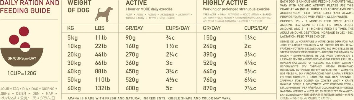 Acana Heritage Sport & Agility Bereid in onze gecertificeerde keukens in Canada is ACANA SPORT & AGILITY rijk aan lokaal gefokte scharrelkip, scharreleieren, in het wild gevangen platvis, zongerijpt fruit en groenten – geleverd rijk aan voedingsstoffen en en smaak door boeren en telers uit onze regio zodat uw actieve hond in optimale fysiekeconditie blijft. Bekijk onze ingrediënten en wij denken dat u tevreden bent. Voedingsadvies: Gewicht hond (kg) Niet-actief (gr/dag) Actief (gr/dag) 2 40 60 5 60 120 10 120 180 20 200 300 30 270 420 40 330 510 50 400 600 60 450 690 Samenstelling: Verse gefileerde kip (16%)*, Gedroogd kippenvlees (16%), Gedroogd kalkoenvlees (15%), Rode linzen, Kippenvet (7%), Hele groene erwten, Vers kippen orgaanvlees (lever, hart en nier)(4%)*, Gedroogde haring (4%), Haring olie (4%), Verse hele eieren (4%)*, Verse gefileerde platvis (4%)*, Zongedroogde alfalfa, Veldbonen, Groene linzen, Hele gele erwten, Vers kippenkraakbeen (2%)*, Gedroogd bruin zeewier, Verse hele pompoen*, Verse hele muskaat pompoen*, Verse hele pastinaak*, Verse boerenkool*, Verse spinazie*, Verse mosterdplant blad*, Verse raapstelen*, Verse hele wortelen*, Verse Red Delicious appels*, Verse Barlett peren*, Gevriesdroogde kippenlever, Gevriesdroogde kalkoenlever, Verse hele veenbessen*, Verse hele blauwe bessen*, Cichoreiwortel, Kurkuma, Mariadistel, Kliswortel, Lavendel, Heemstwortel, Rozenbottels. *= ingrediënten VERS aan de bereiding toegevoegd. Analytische bestanddelen: Ruw Eiwit 35%, Ruw Vet 22%, Vocht Toevoegingen: E6 (Zink)