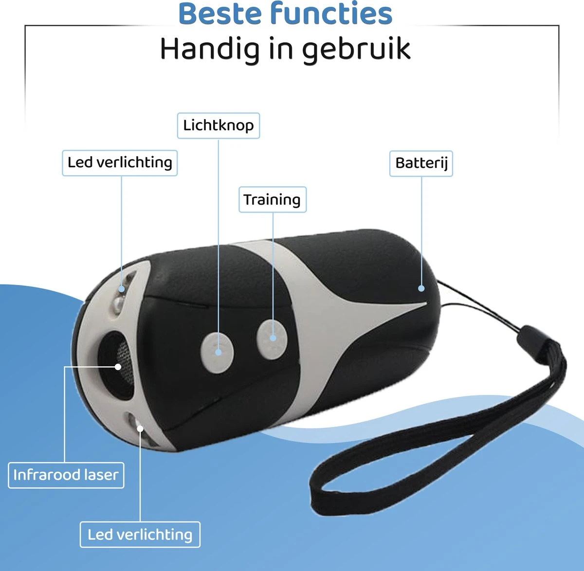 Op het apparaat zit ook een LED lampje die te gebruiken is als een kleine zaklantaarn. Dit helpt bij het trainen van je hond en de hond zal hier geen schadelijke ervaring van hebben. Daarnaast ook handig bij gebruik van het apparaatje in het donker.