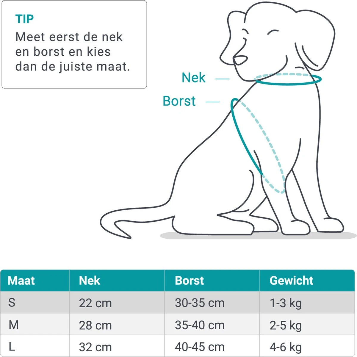 Wij adviseren u om eerst de nek en borstmaten van uw hond goed op te meten, voordat u gaat bestellen zodat teleurstellingen voorkomen worden. Om te bepalen of een tuig goed zit, is het belangrijk dat er twee vingers tussen het tuig en de huid van de hond passen. Zit hij strakker, dan kan het voor de hond oncomfortabel zijn en kan het tuigje schuren bij het bewegen. Bij twijfel kunt het beste een grotere maat bestellen.