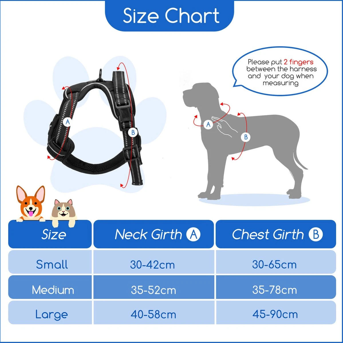 Maat S: Instelbare maten: Nek omtrek laag (C) van 30 cm tot 45 cm x Borst omtrek (B) van 30 cm tot 65 cm