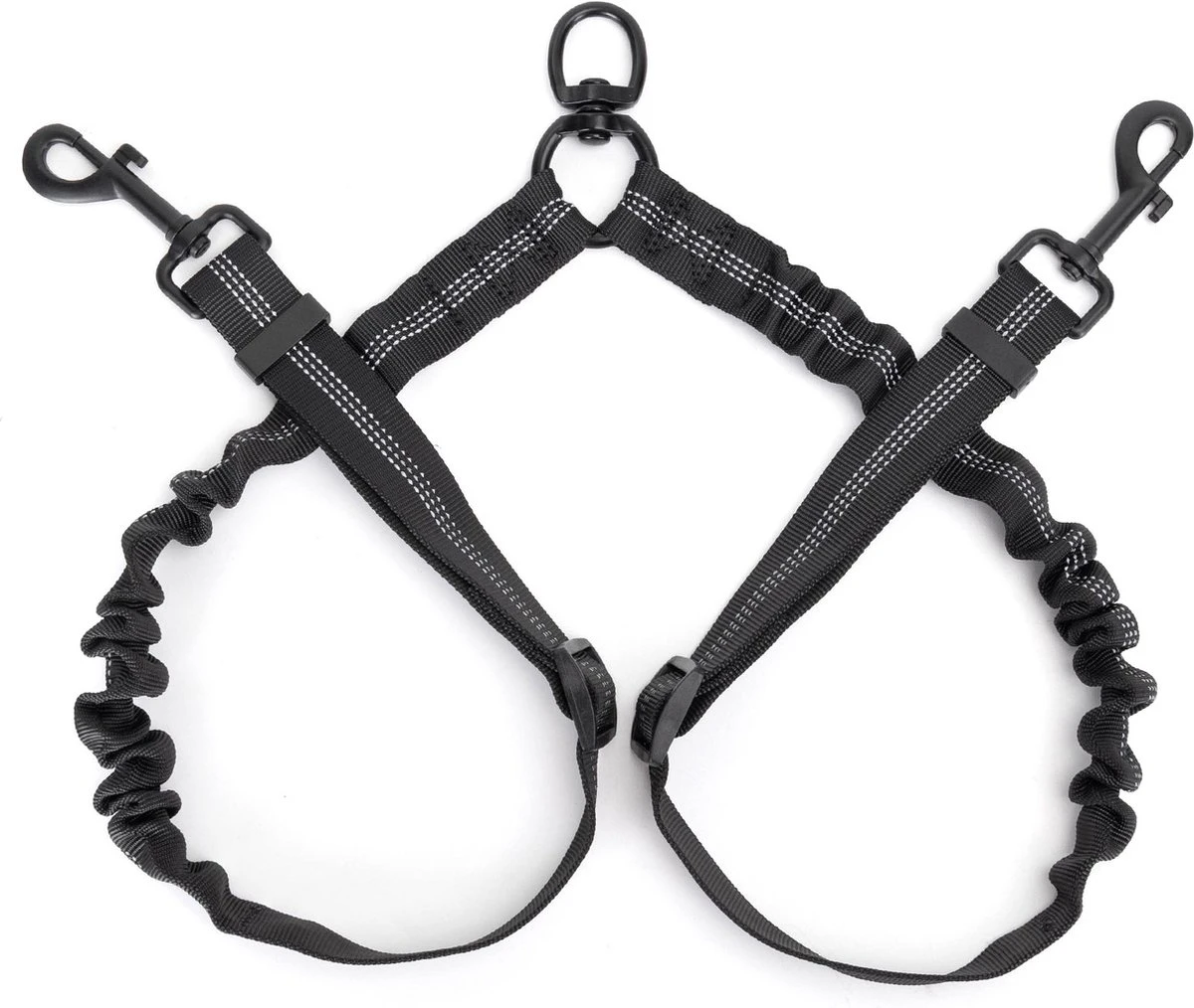 Zo kun je met twee honden aan één riem uitlaten. Beide verlengstukken hebben een elastisch gedeelte die de schokken opvangt.