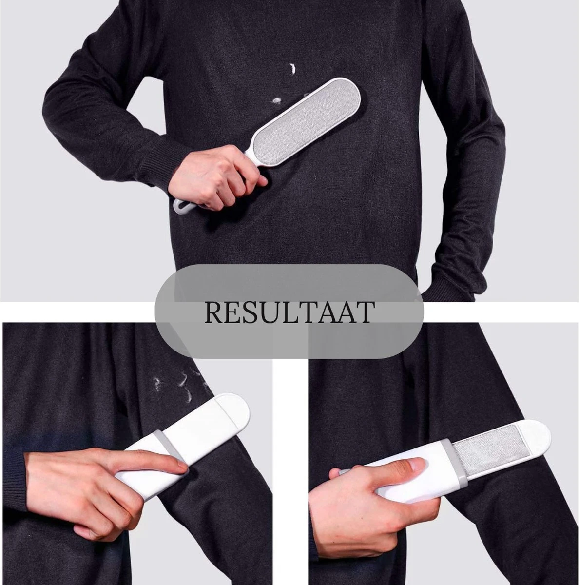 De dubbelzijdige borstel heeft duizenden microborsteltjes aan beide zijden die werken als een magneet die elke haar, pluis of stofdeeltje oppakt. Na gebruik plaatst u de pluizenborstel terug in de houder. In deze houder bevinden zich microborsteltjes die de pluizen en haren verwijderen van de borstel waarna dit verzameld worden in het opvangbakje aan de onderkant. Het opvangbakje kan hierna geleegd worden.