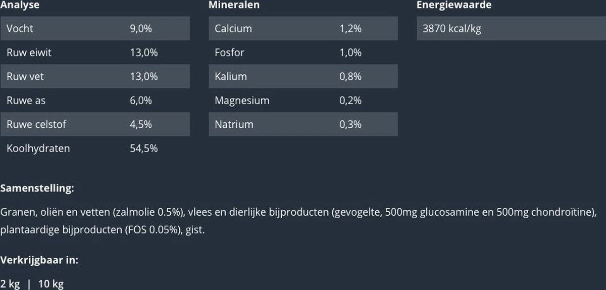 ProCare croque senior Superior is een hoogwaardige voeding die ondersteuning biedt aan jouw hond op leeftijd. Een verlaagd eiwitgehalte en aangepaste hoeveelheid mineralen ontlasten de nieren. Door de toevoeging van glucosamine en chondroïtine wordt het kraakbeen extra ondersteund en de gewrichten soepel gehouden. De natuurlijke vezels die in de voeding zitten dragen bij aan een optimale stofwisseling en handhaving van het juiste gewicht waardoor je oudere hond zich prima kan blijven bewegen.