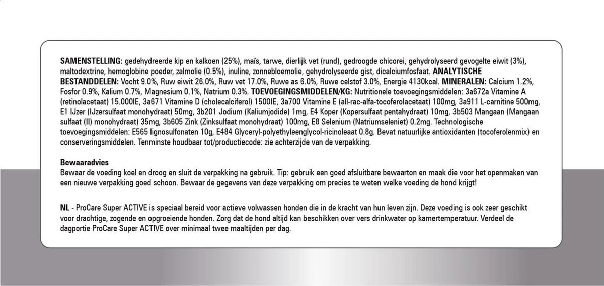 ProCare Super is een hoogwaardige voeding speciaal voor opgroeiende en actieve honden die in de kracht van hun leven zijn. ProCare Super houdt de hond in goede conditie en zorgt voor een gezonde en glanzende huid en vacht. Essentiële vetzuren leveren voldoende energie voor jouw actieve hond. De hoge verteerbaarheid zorgt voor een optimale opname van alle voedingsstoffen. Zo blijft uw hond actief en speels zoals u van hem gewend bent! De toevoeging van L-carnitine zorgt voor een optimale vetverbranding.