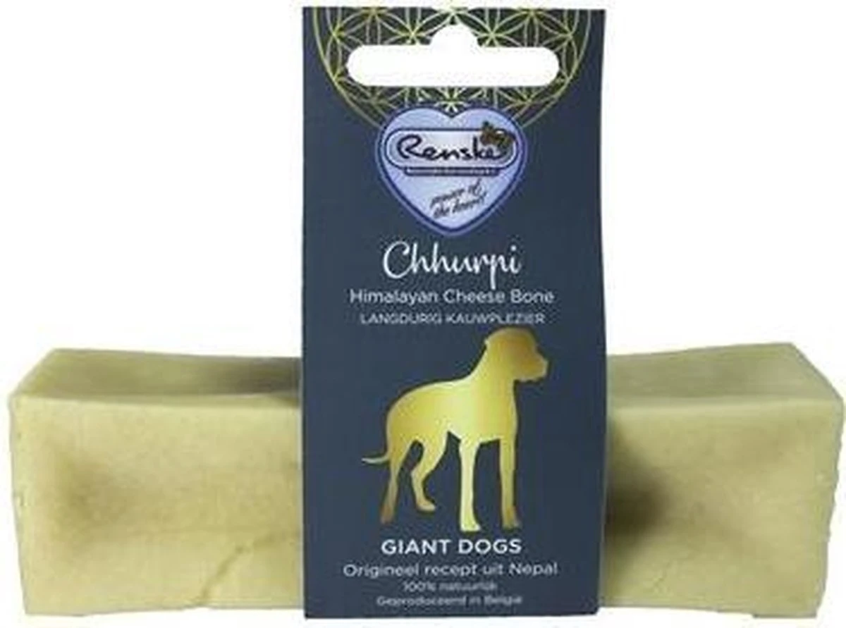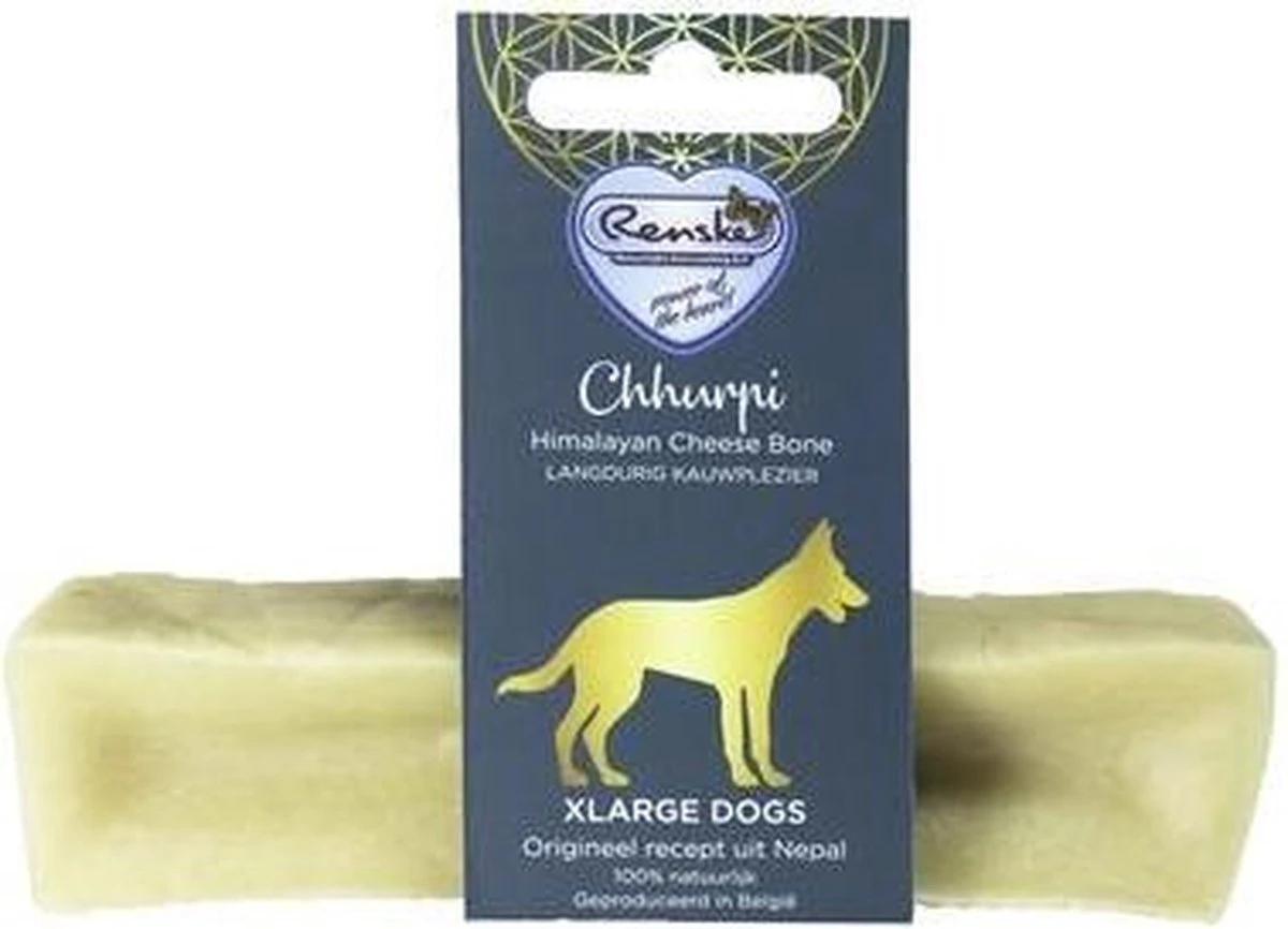 De Renske Chhurpi Kauwkluif L 90 gr is een natuurlijke hondensnack van kaas, gebaseerd op een recept uit de Himalaya zonder gluten en granen. Een gezonde beloning waar jouw hond lekker een tijdje zoet mee is. Deze snack is gemaakt op basis van een eeuwenoud recept uit de Himalaya, dat enkel gebruikt maakt van melkproducten. Geen granen of gluten dus! Jouw hond zal graag kauwen op deze natuurlijke kaassnack, wat helpt bij de verzorging van het gebit en verveling tegengaat. Dat maakt dit de ideale traktatie of beloning voor jouw hond. Tip: verwarm het laatste stukje van de Chhurpi in de magnetron voor een heerlijke, gepofte kaassnack.