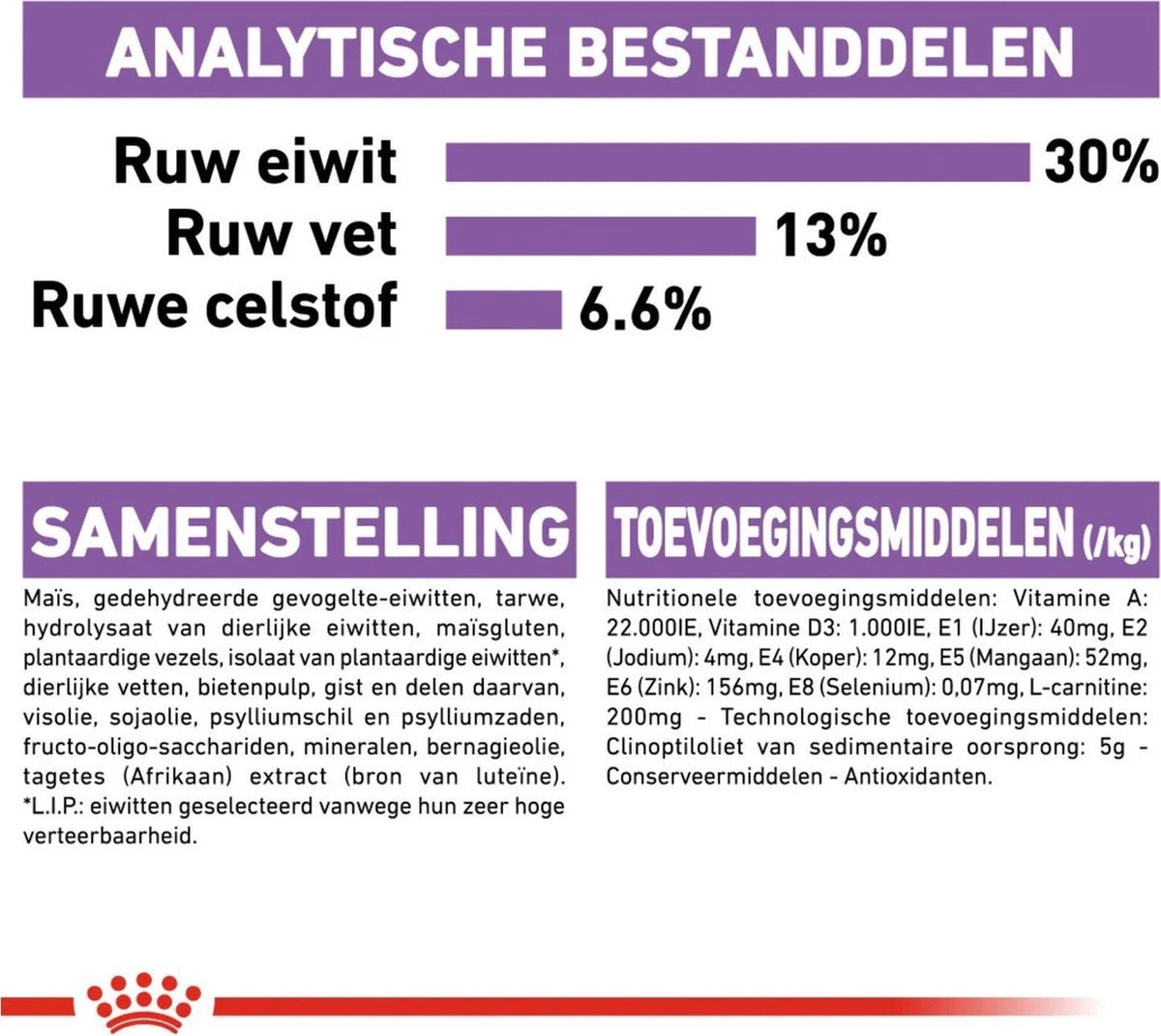 | Analytische bestandsdelen | ANALYTISCHE BESTANDDELEN: Ruw eiwit: 30,0% – Ruw vet: 13,0% – Ruwe as: 5,4% – Ruwe celstof: 6,6%. |