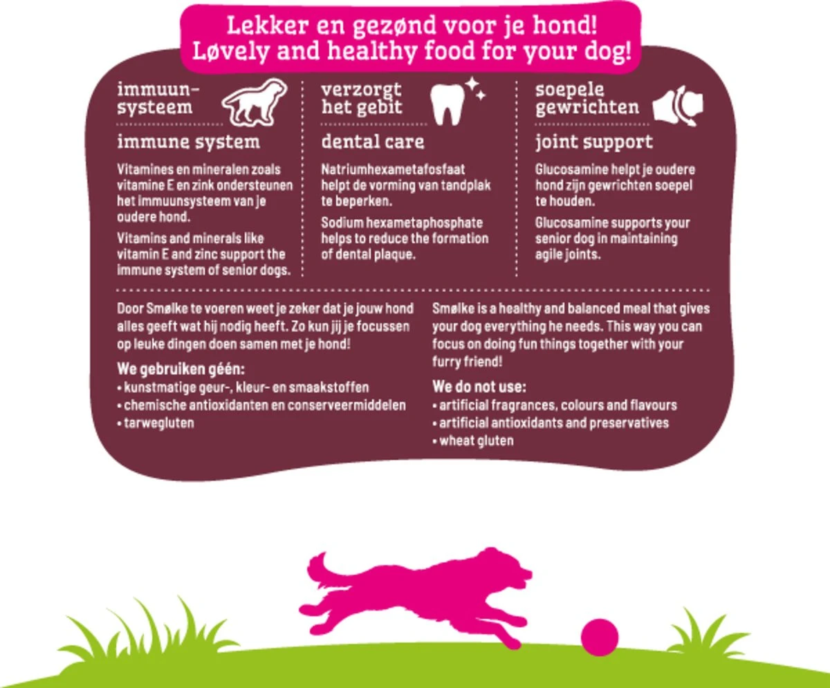 Smølke Senior Maxi is een compleet Alles-in-één hondenvoer met natuurlijke ingrediënten dat jouw senior hond helpt bij het vitaal ouder worden.