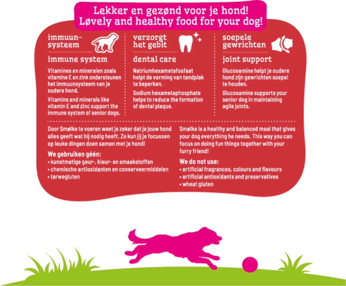 Smolke Senior Mini 3 KgSmølke Senior Mini is een complete Alles-in-één hondenvoeding afgestemd op de behoefte van kleine honden vanaf 8 jaar met een maximaal gewicht van ca. 10kg. De voeding is samengesteld zonder tarwegluten en bevat speciale mineralen om tandplak te helpen voorkomen. Smølke Senior Mini is gemaakt met natuurlijke ingrediënten en heeft een uniek eiwitprofiel bereid met Nederlandse kip, MSC vis en Brits lam. Smølke Senior Mini is een gezonde en gebalanceerde voeding die je hond ondersteunt bij het vitaal ouder worden. Natuurlijk zonder kunstmatige geur-, kleur- en smaakstoffen en chemische antioxidanten.