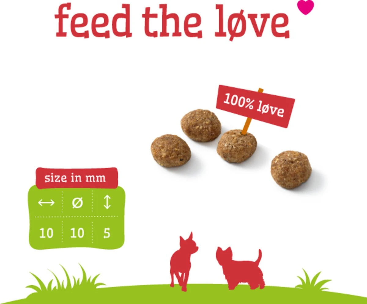 SamenstellingKippenmeel (18%), mais, gerst, rijst, sorghum, kippenvet (gestabiliseerd met natuurlijke tocoferolen), lamsmeel (4%), bietenpulp, gehydroliseerd eiwit, cellulose, MSC-gecertificeerde vismeel (2%)*, vitaminen en mineralen mix, gist, MSC-gecertificeerde visolie (0,8%)*, cichorei, natriumhexametafosfaat (0,1%), glucosamine (0,022%) . *Uit een MSC gecertificeerde duurzame visserij.